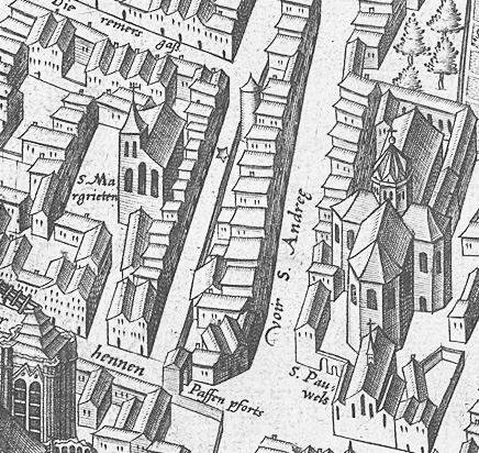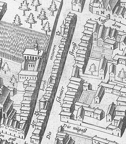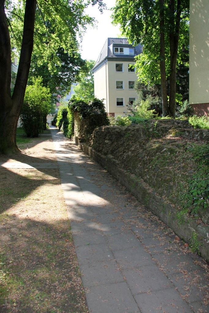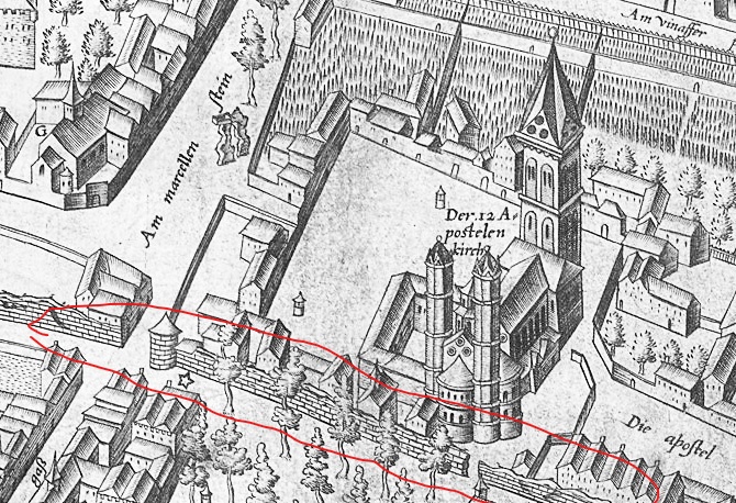Here you can see how the houses are built on top of the wall. You can still see the two towers in between too. (in the middle) click to enlargeIn the middle you can also seen how the wall is still used as a foundation for houses. In the south you even see a Roman gate and further up north another watchtower.As you can see, the Roman city wall was also used to demarch your property. The foundation of one tower is also used for the apsis of the church St. Aposteln.