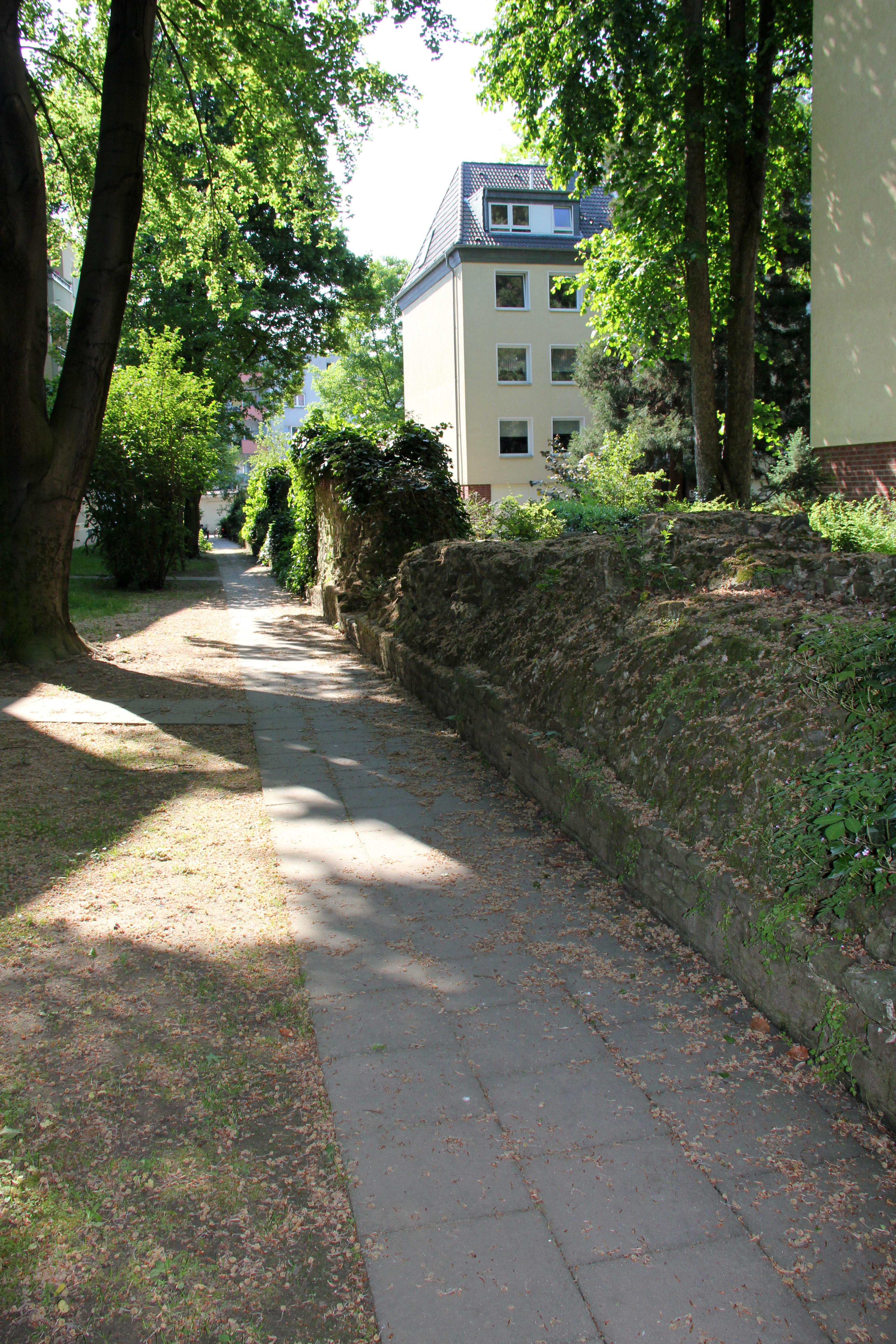 This is the part of the Roman City Wall that fell victim to vandalism. And it is today in an even worsened state. Von HOWI – Horsch, Willy – Eigenes Werk, CC BY-SA 4.0, https://commons.wikimedia.org/w/index.php?curid=2035062