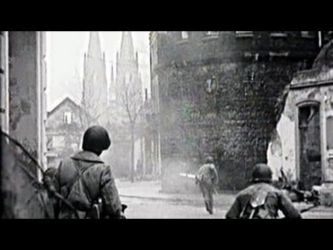 Picture of the upcoming famous Panzerduell in Cologne on March 6th, 1945. US soldiers are coming from the west, fighting their way into downtown. On the right you can see the Roman watchtower. By a mircale no bombs had hit it. In the far distance, about 800 meters away you can see the Cologne Cathedral. After years of bombing, the cathedral was the only orientation point in the city. From there the enemy German Panther tank will soon shoot at these US soldiers. The last battle of WW2 in Cologne.