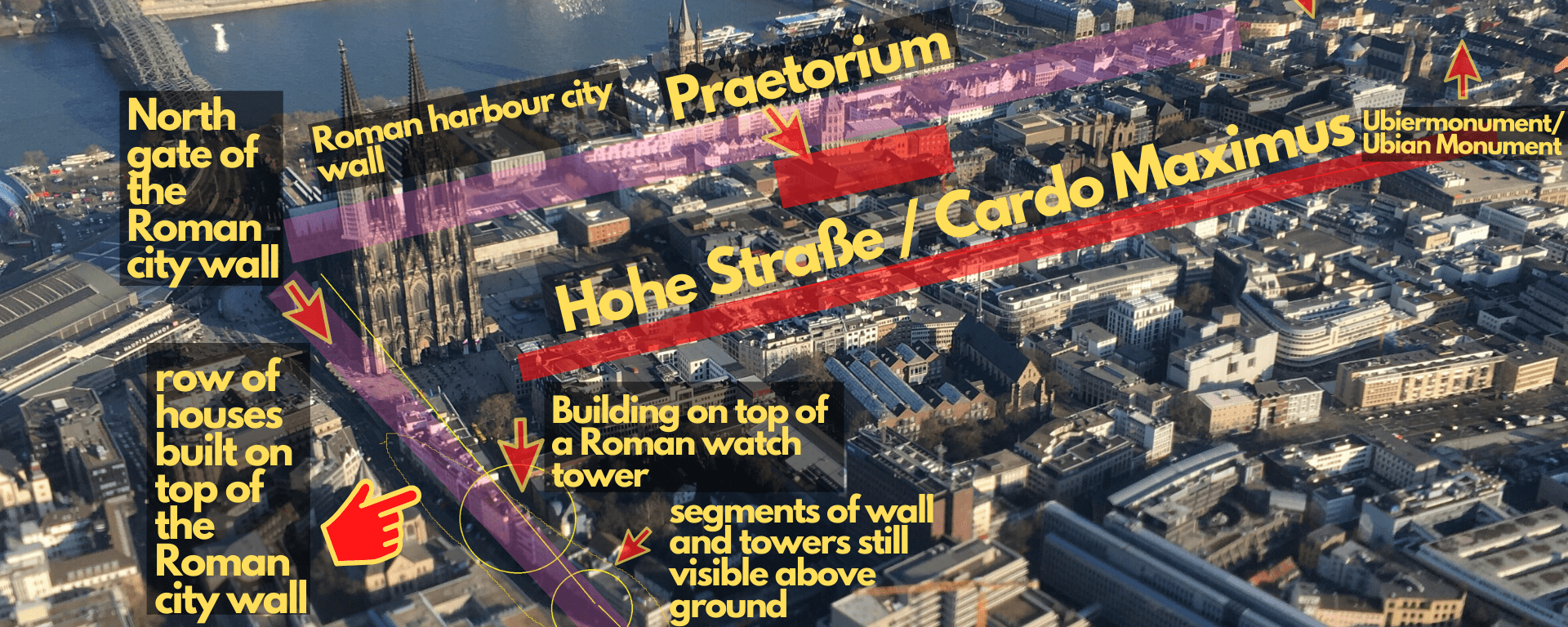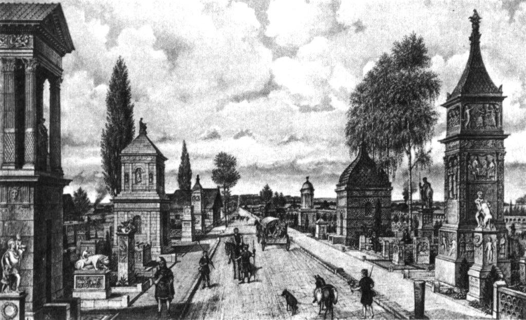 CLICK TO ENLARGE! This is the way we enter ancient Cologne from the north. The blue circle is where we walk through the northern gate. Left 1,800 years ago, on the right today. Many parts of the Roman city wall are still used as foundations. (yellow line)Reconstruction of how a Roman street to ancient Cologne might have looked like. As you can see. The tombs are right next to the street.