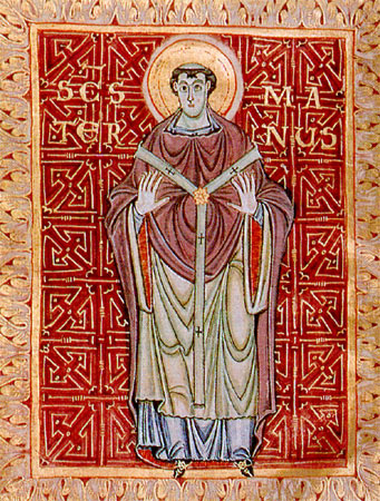 A statue from Bishop Maternus from the 18th century.Maternus von Köln. Image from Egbert Psalter (Gertrude Psalter). Now in the Museo Archeologico Nazionale of Cividale, Italy. 10th century