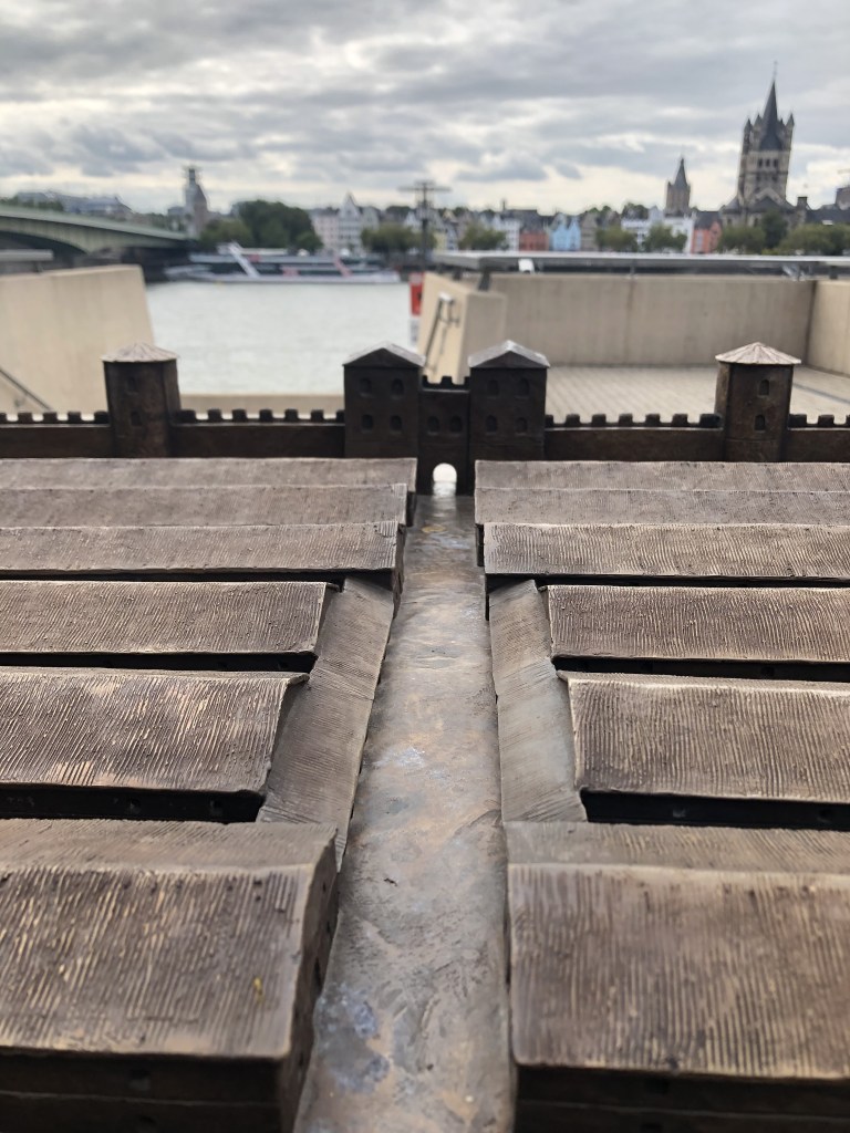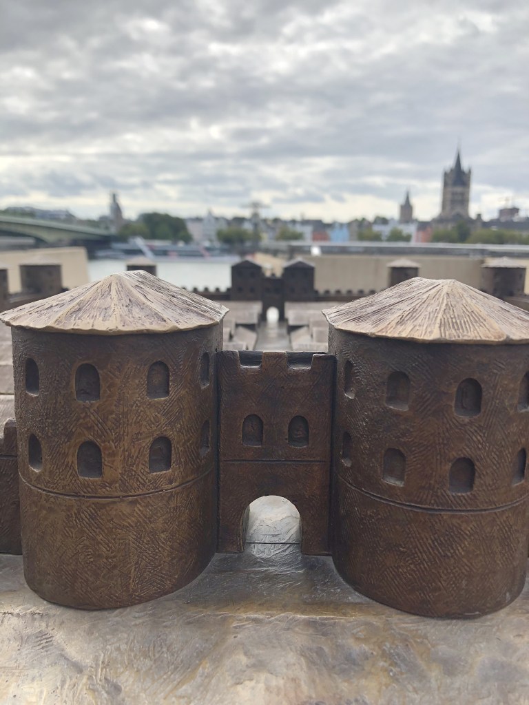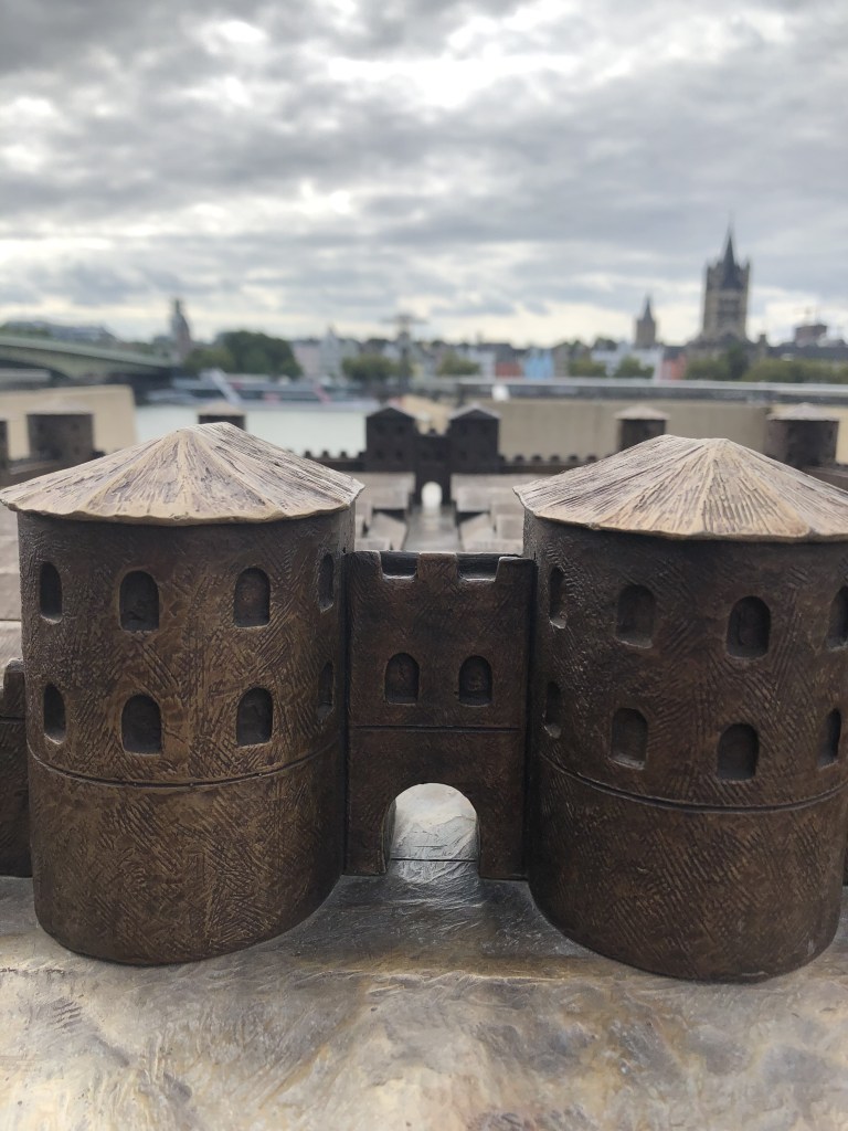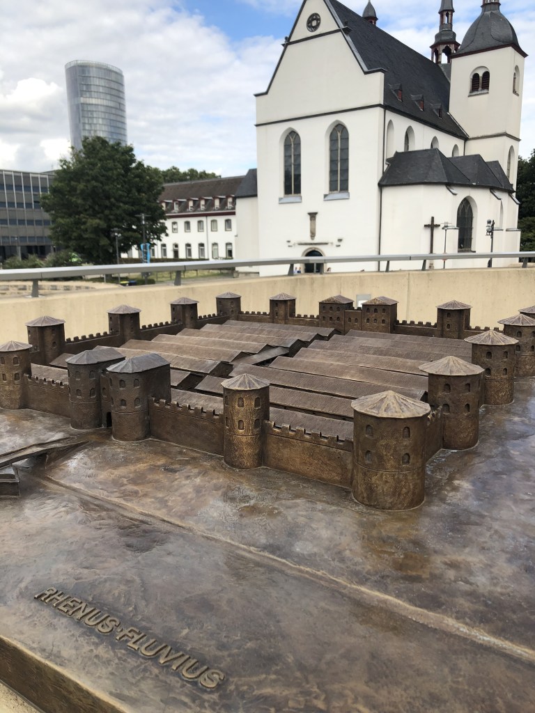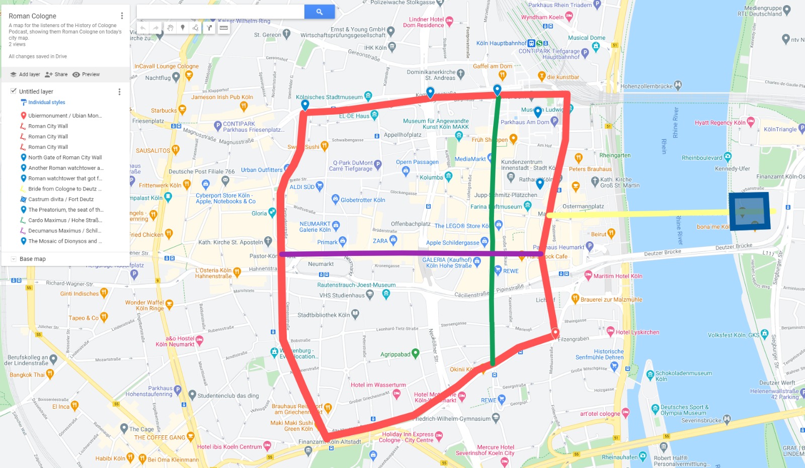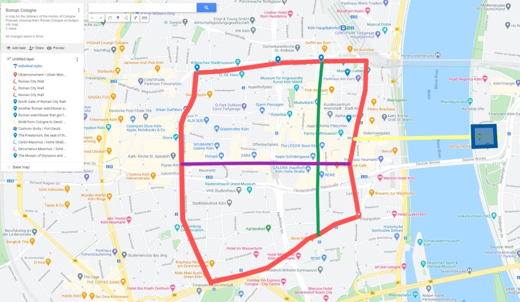 I tried to make a Map that shows where Roman Cologne would be in modern day Cologne. Notice how many streets still exist today. For example the ones marking the city wall (red) or Hohe Straße/Cardo Maximus (green). The Fort Deutz is the blue square on the right with the bridge (yellow)