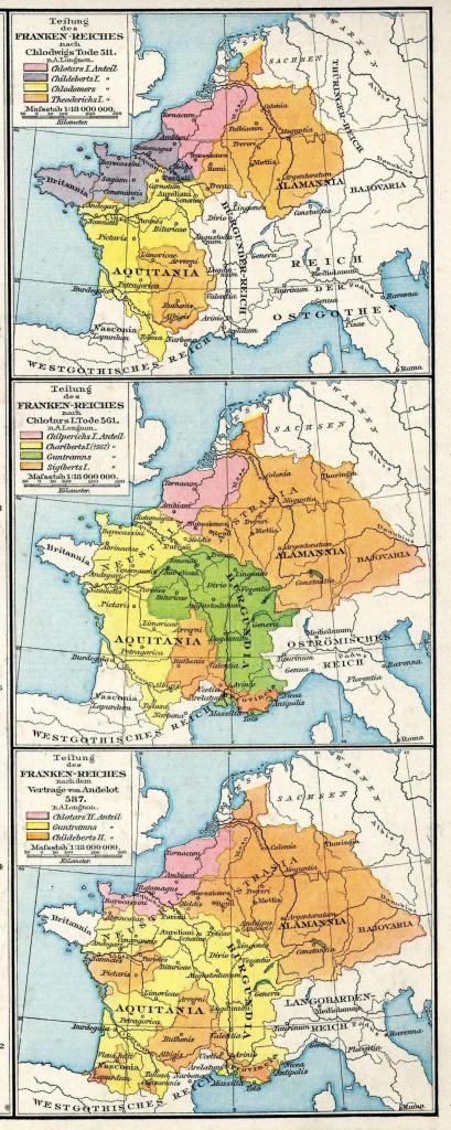 Everything in color was conquered and ruled by Clovis up until his death in 511. Then the empire was divided between his four sons. Cologne is in the east as titled here in the “Royaume de Theoderic I” Kingdom of Theoderic I