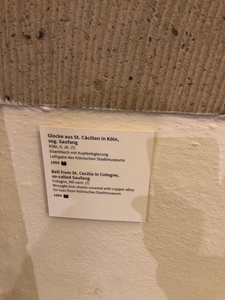 The “Saufgang”-Bell in the Kölnisches Stadtmuseum (Cologne City Museum). But nowadays you can find it in the Museum Schnütgen in the former church of St. Cäcilien. This bell was blessed by bishop Kunibert after it would not ring after it was found. Experts, however, are largely certain that the bell does not date back to the 7th century, but to the 9th century. Although this makes the bell 200 years younger, it still makes it the oldest church bell in Germany preserved to this day!!!!! And yes, it does really ring. 😉