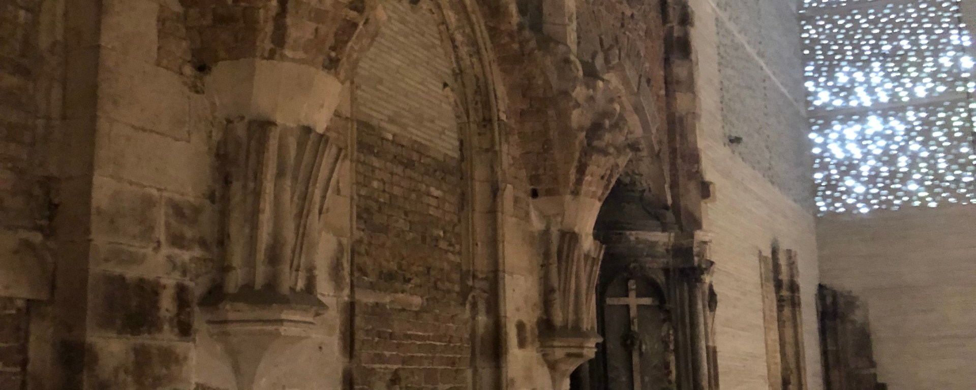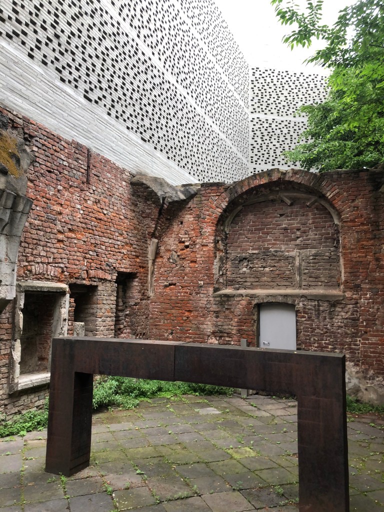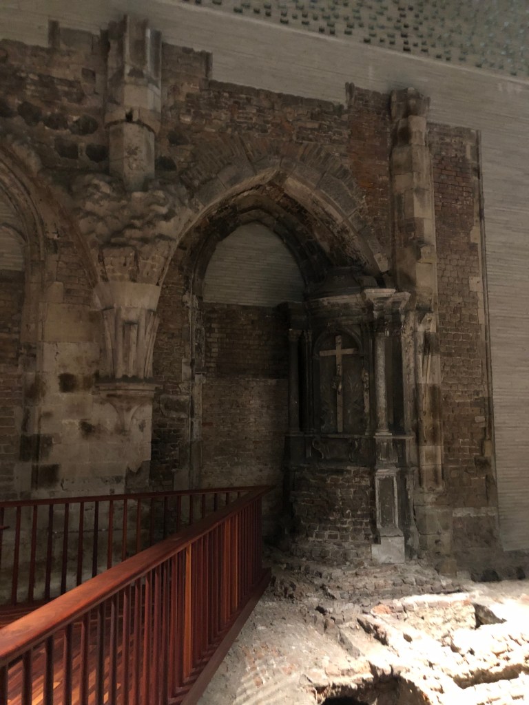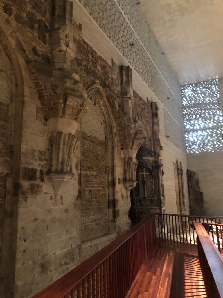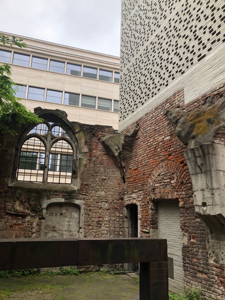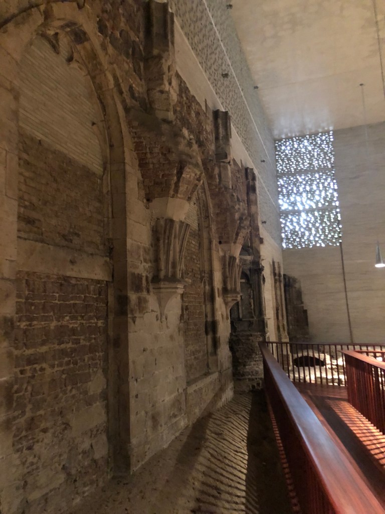 For centuries, St. Kolumba was one of the largest parish churches in Cologne. Unlike the churches described here so far, it was not a collegiate church or belonged to a monastery. The church building in its last form was documented since the 10th century. The predecessor building probably originated from Frankish times. This made it one of the oldest still continuously preserved church buildings in Cologne with over 1,000 years of history. In 1943 it was completely destroyed in the course of the Second World War. Its destruction was so severe that it was decided not to rebuild. Furthermore, the destroyed church in the heart of Cologne was considered a memorial against war in general. Only a small chapel was built in its ruins. The site was archaeologically researched and integrated into the new art museum of the Archbishopric of Cologne in 2007. I must say I was thrilled at how well the remains of the ruins were merged with the new building here. But see for yourself. Care has been taken to use the same building material as was once used for the church. But have a look at the pictures yourself.