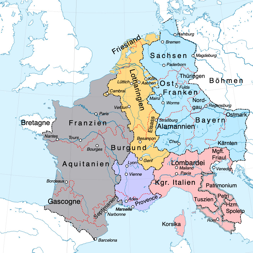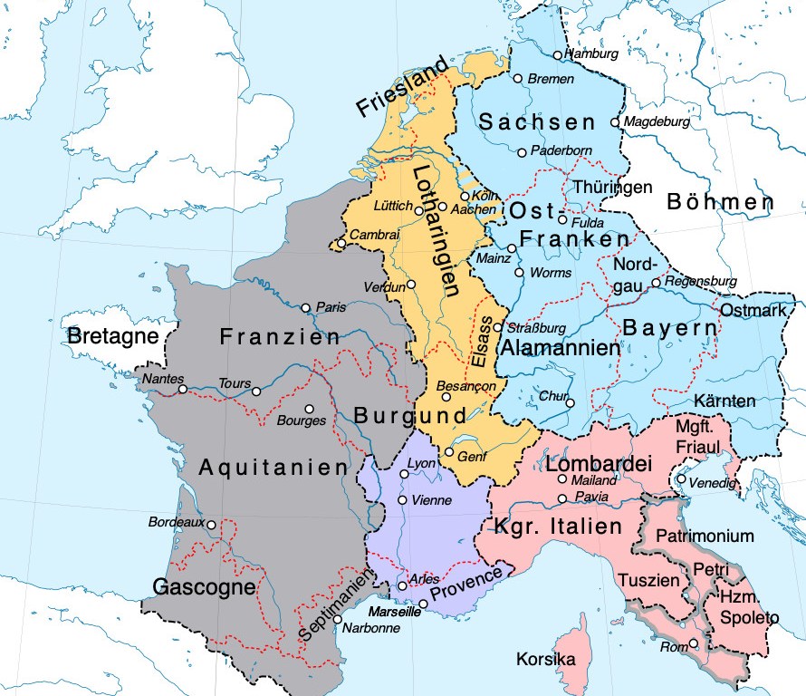 At the end of the Frankish double divorce drama, the Lotharingian Middle Kingdom doesn’t exist anymore. (Middle Kingdom in yellow-red borders) It gets swallowed up by its neighbors on each side. The western Frankish Empire and the Eastern Frankish Empire. Later known as France and Germany.