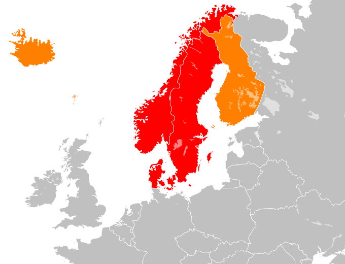 Map showing two of the common definitions of “Scandinavia”; a cultural, historical and ethno-linguistic region in northern Europe. Most common referred as Scandinavia are Denmark, Norway and Sweden. Sometimes even Finnland and Iceland.