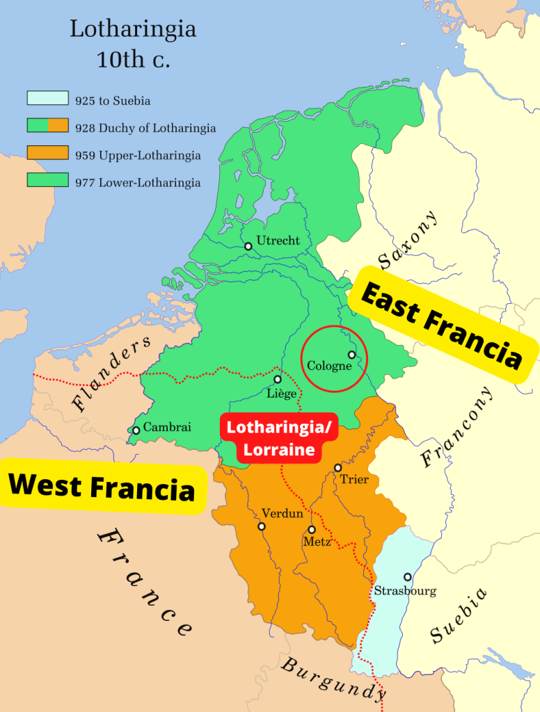 Cologne is in an intermediate phase around the year 900. In the whole region of the former Frankish Middle Kingdom of Lothar the question is going around, which empire can protect it better? To which sub-kingdom of Charles the Great’s former Frankish empire do people feel more attached? The West Frankish Empire, which later became France? Or to the Eastern Frankish Empire, which later becomes the Holy Roman Empire and the Kingdom of Germany?
