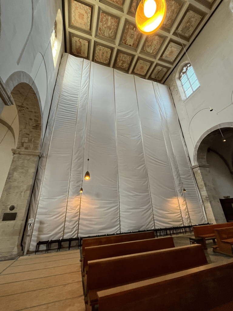 Where now on the side you can see the pillar arches, separating the central nave from the side aisles of the church, there used to be a wall. The side aisles later extended the original hall construction.As you can see, the restoration is in full swing. Look at the ceiling though, isn’t it gorgeous?