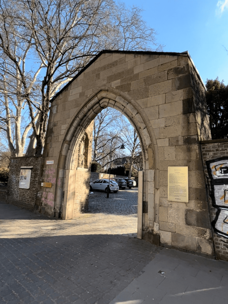 While the cathedral was located within the Roman city walls, St. Andrew’s was still directly in front of the city walls in the early Middle Ages. You can see that clearly here in this wide-angle snapshot. The tower in the center is indeed built on a Roman watchtower foundation. The wall itself runs parallel to the street. Therefore, the street on the right is also higher than the street on the left side of the picture. History, truly tangible!