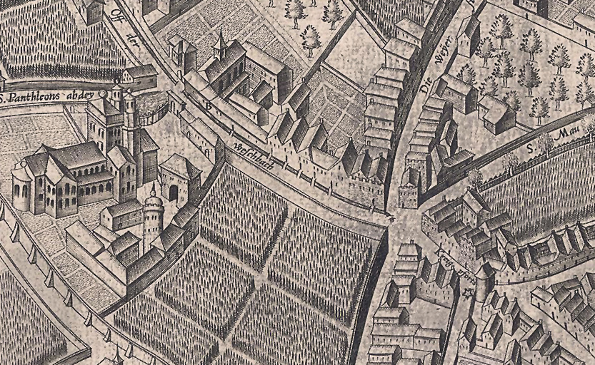 As promised in the podcast, I had promised a shot from the north side of the basilica. I took that photo, too, but this photo from Wikimedia Commons is much better. I have drawn in red, the original core part of the church from the 10th century. Only this part was built shortly after Bruno’s death.Everything else are additions and alterations from later times. The mighty westwork, here on the right, was added some years after Bruno’s death and dominates the facade of the church until today. St.Pantaleon is one of the few churches that were built before the year 1000 in Cologne and Germany in general and were not completely rebuilt in the course of the High Middle Ages (11th-13th century).No, here stands until today the original with the central building from the 10th century.