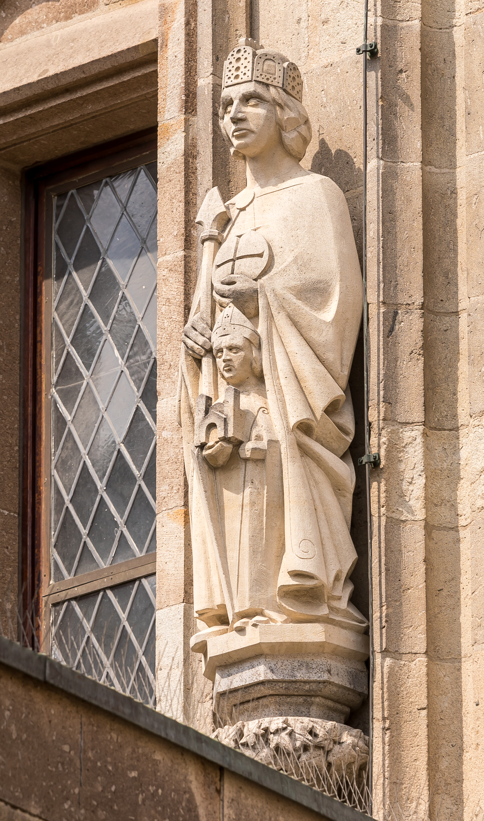 Figure of Emperor Otto I with crown of the Holy Roman Empire and insignia of rule in his hands. He is significant for the city, as he resided here like no medieval ruler before him in the city and had a lasting impact on Cologne’s development with the installation of his brother. At his feet his truly younger brother Bruno with a model of St. Pantaleon in his hand. Thus Bruno is even depicted twice on the Cologne City Hall tower.