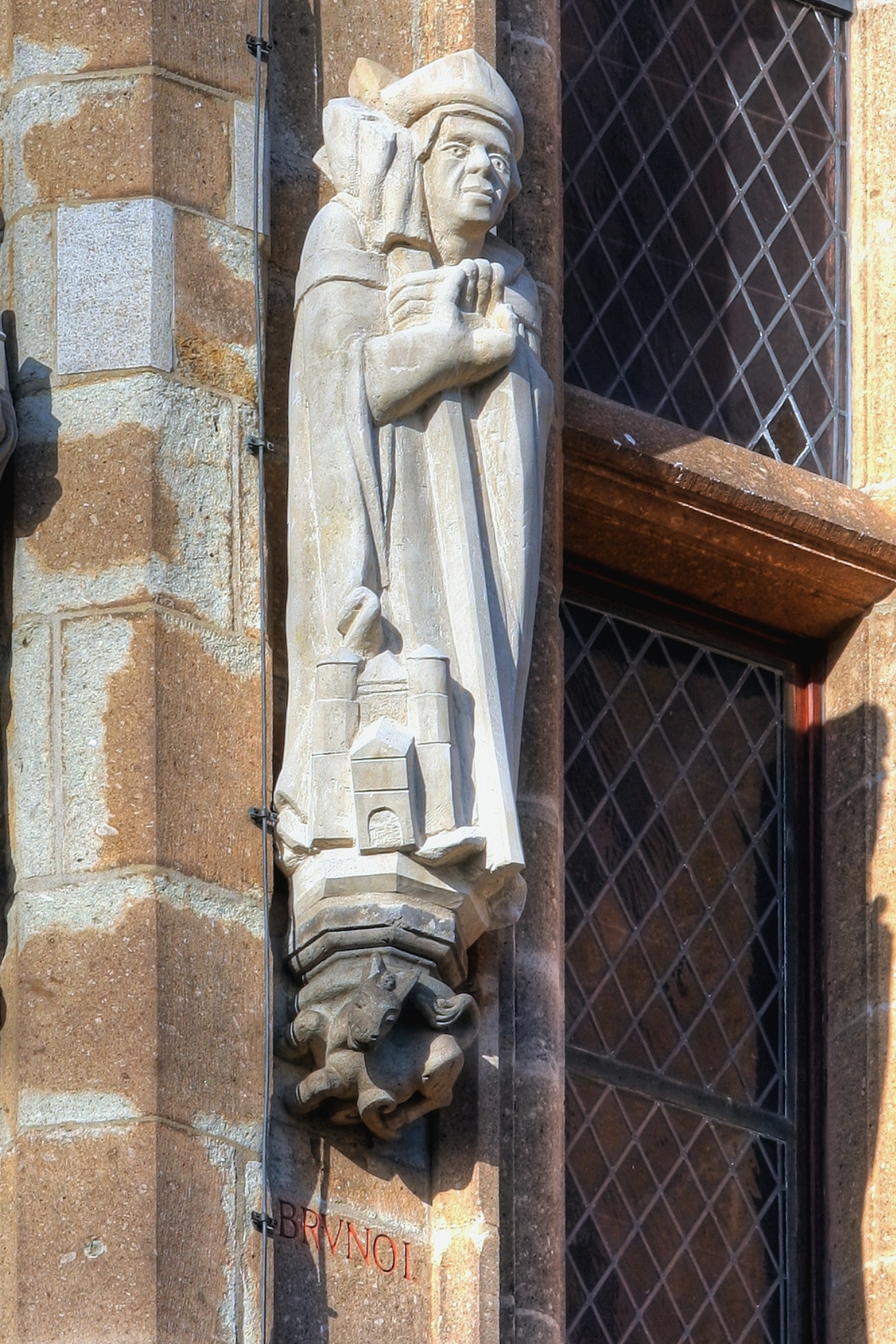 Here Bruno is depicted as an adult and powerful archbishop and duke of Lorraine. In one hand he holds the crozier, with the other hand he commands. This is to show that he held spiritual and temporal power. At his feet a model of St. Apostles, the church he founded in the west of Cologne and today dominates the Neumarkt square.