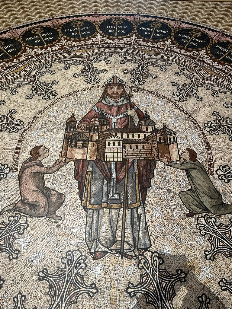 Hildebold with a model of the Old Cathedral in today’s gothic Cologne Cathedral. The mosaic was made in 1899 by Villeroy & Boch.