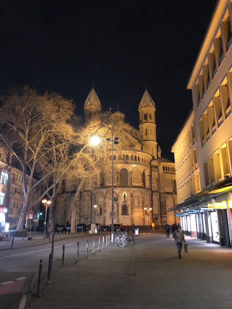 St. Aposteln (St. Apostles) at night at the eastern end of the Neumarkt square. In the year 1,000 stood a modest predecessor building here. Where today’s choir is visible and we look at in this image, the Roman city wall would still be standing. The conch in front of us was built partly on the foundation of a Roman watchtower. In three meters above the ground, next to the statues, you might see a little bricked up door. This way, the priests could simply walk directly from their church on the city wall to get through the city.