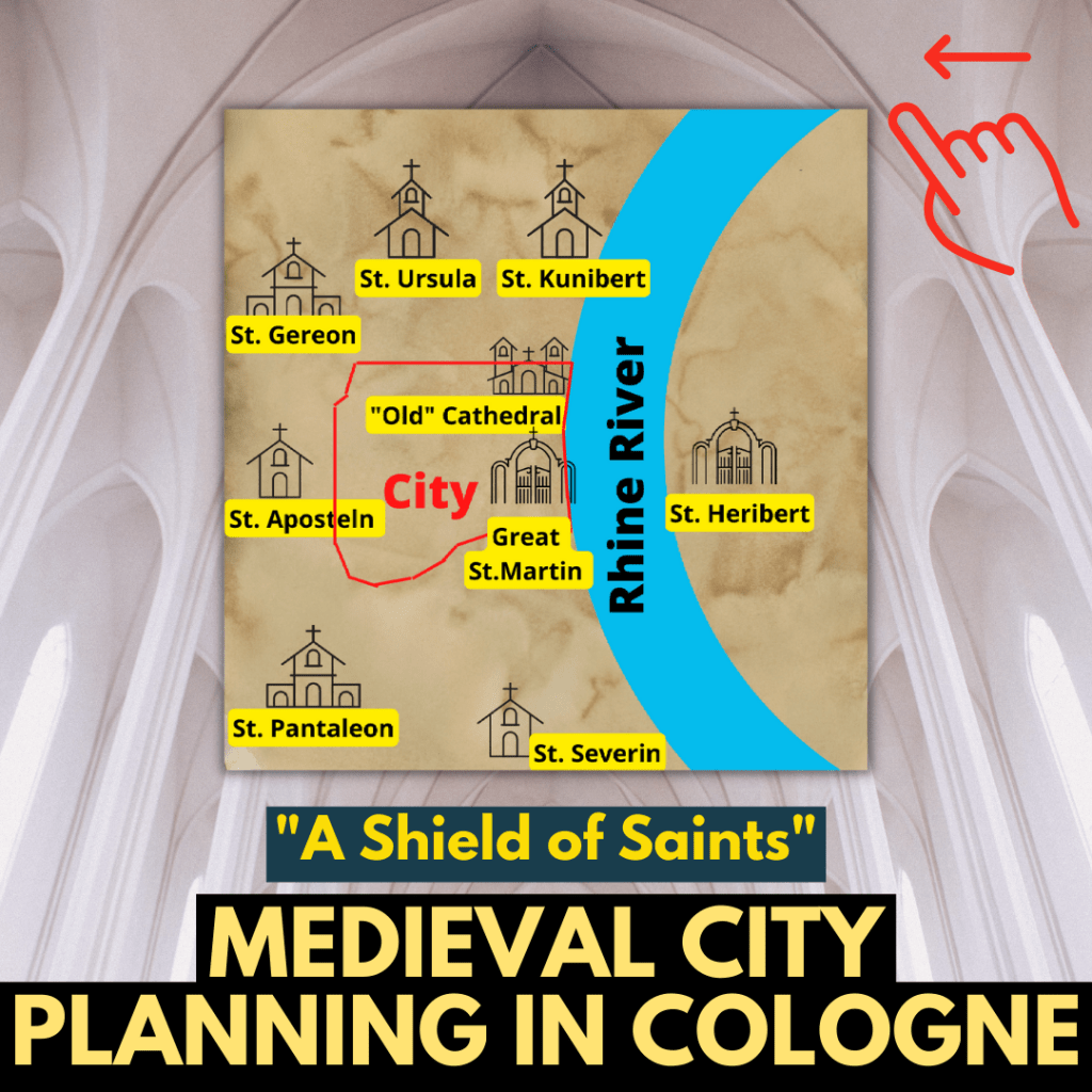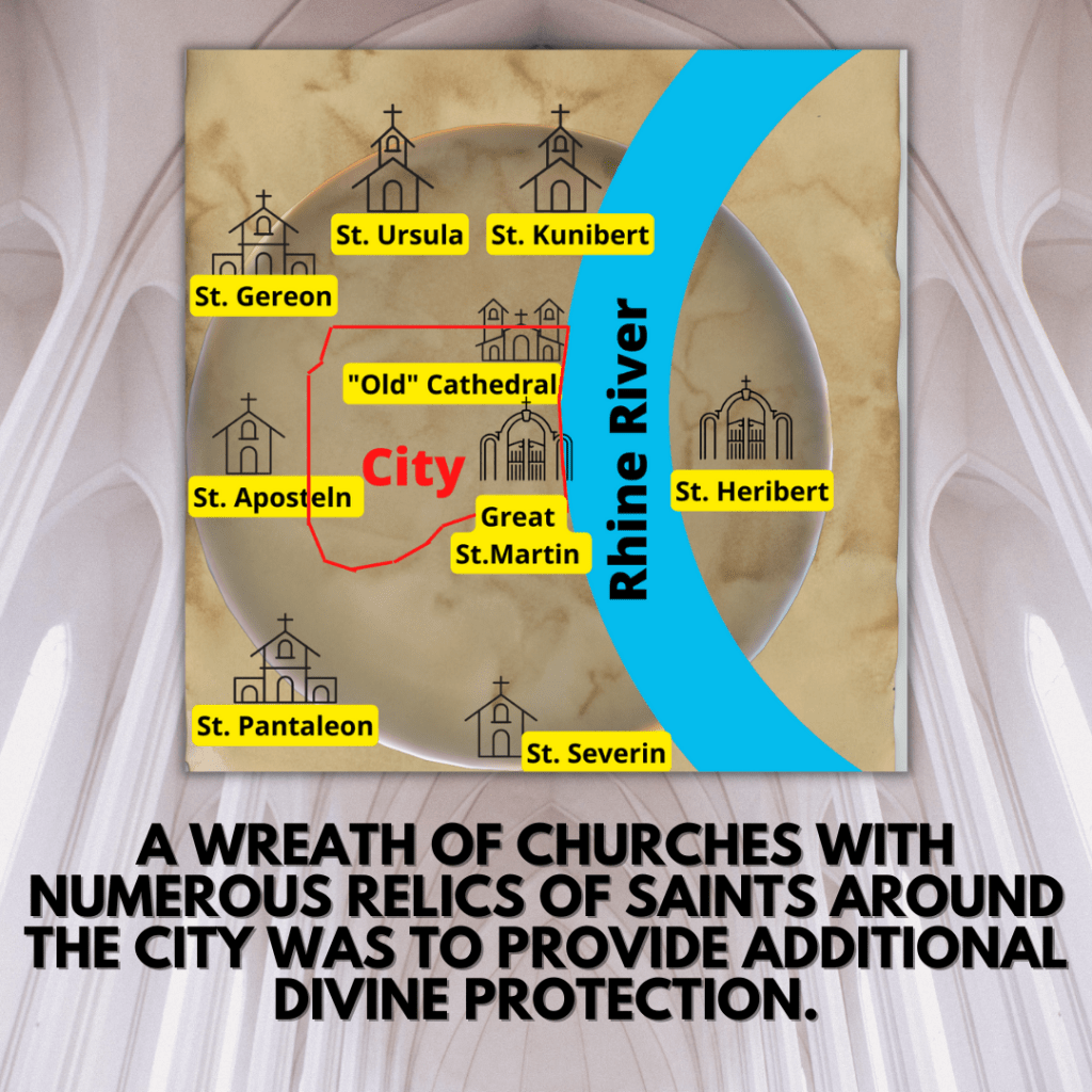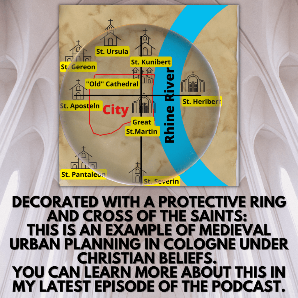The protective ring of saints around Cologne at the end of the Early Middle Ages. ⚠️Please be aware that I am not a graphic designer. But I wanted to illustrate this topic somehow graphically for you. Keep in mind that I have not drawn in all the churches of Cologne. Of course, St. Andrew or St. Mary in the Capitol, among others, would also be important for the cross or the protective wreath, which was supposed to protect Cologne next to the city wall itself.