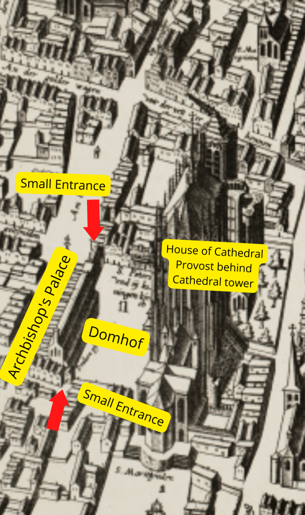 Yes, this maps is a few centuries later, the 16th century so to speak, but the medieval structure of the city was still there and would be way into the 1700s. Here you can still see the elements of the surroundings of Cologne Cathedral mentioned in the episode. This enclosed area that is nowadays totally gone.