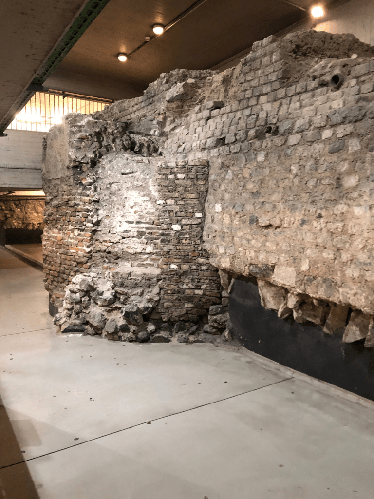 The Roman city wall is underground due to the nowadays higher cathedral plateau and is part of the underground parking under the Cologne Cathedral.