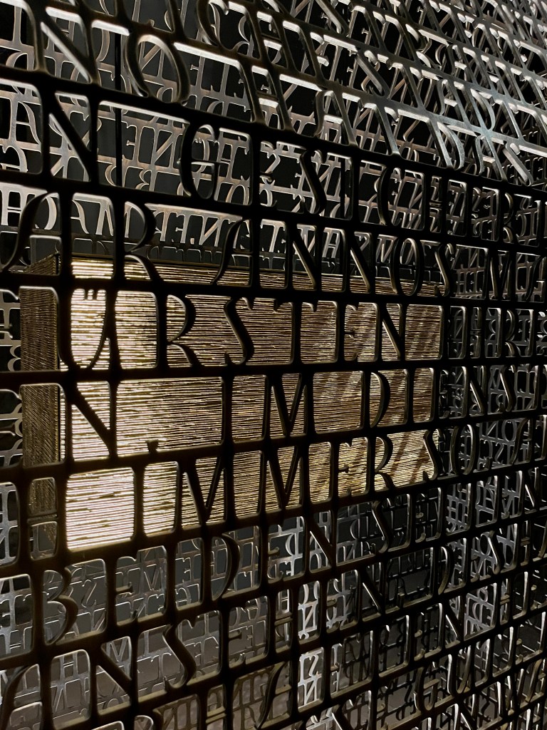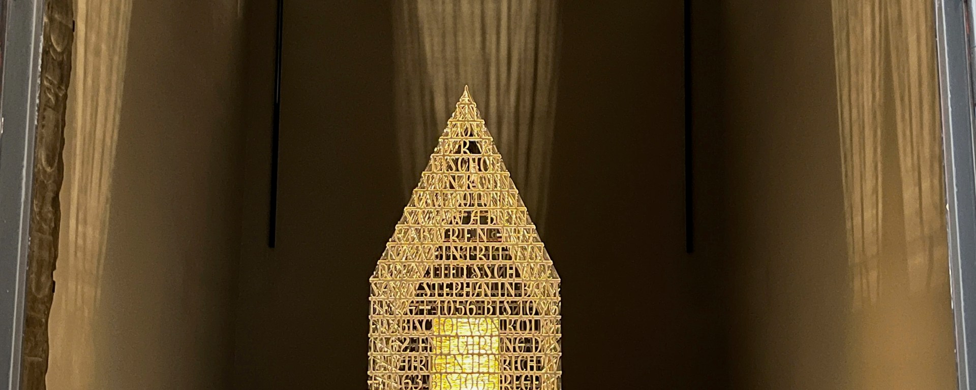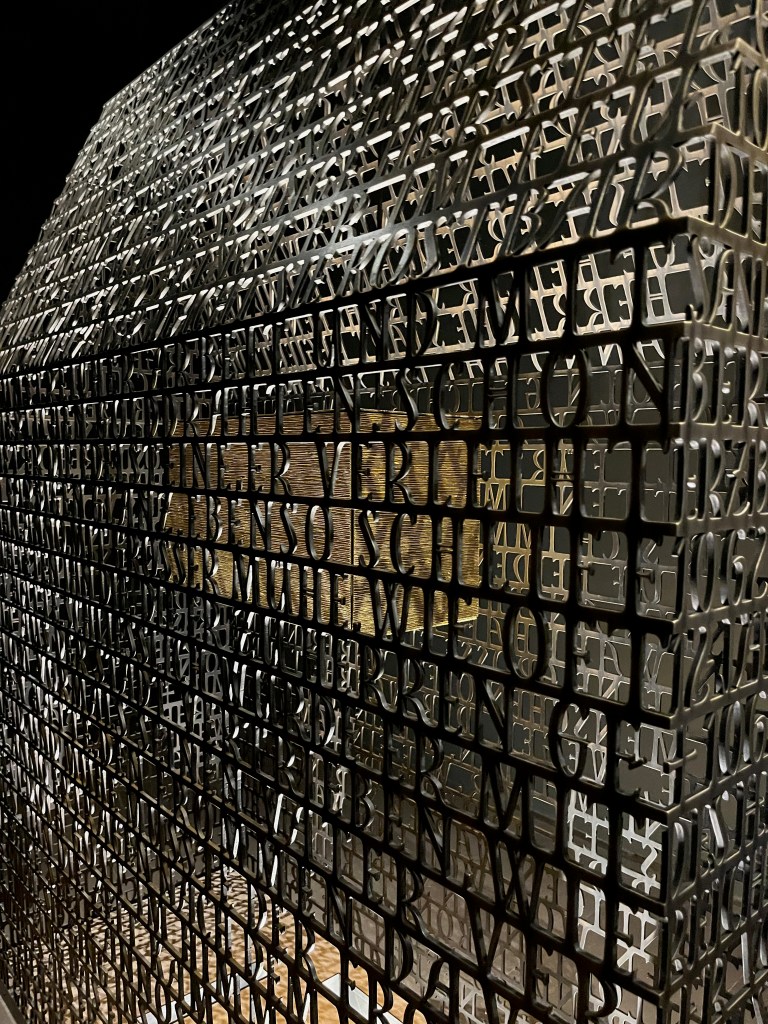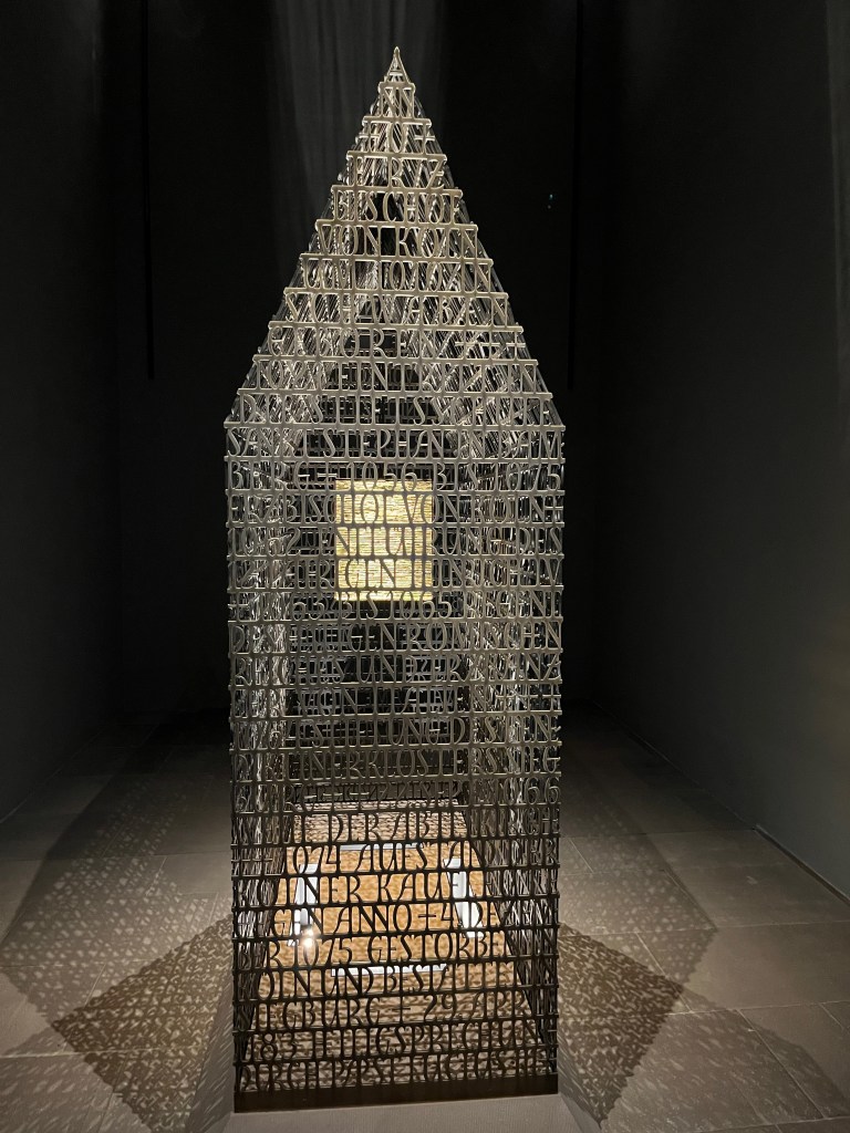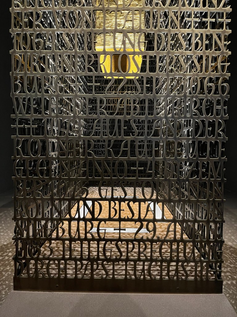 If you disagree here, ok. But I was blown away when I saw what American artist Brody Neuenschwander had created. When you enter the abbey church, and immediately go to the right through a passageway, you enter an almost dark room. In the center is Anno’s new shrine. At first glance in the form of a transparent house. When I stepped closer, I saw that the outer shell of the house simply times an entire biography in text form. A house of letters. In the middle of this letter house floats a suspended golden box, in which the bones of Anno are inside. The shrine stands, as I said, in a dark room. From the ceiling, a concentrated golden light falls directly into the center of this shrine house. Because of the metal surface, this causes the light to shine faintly but clearly through the dark room.