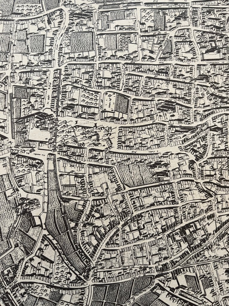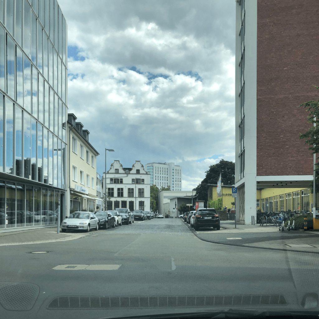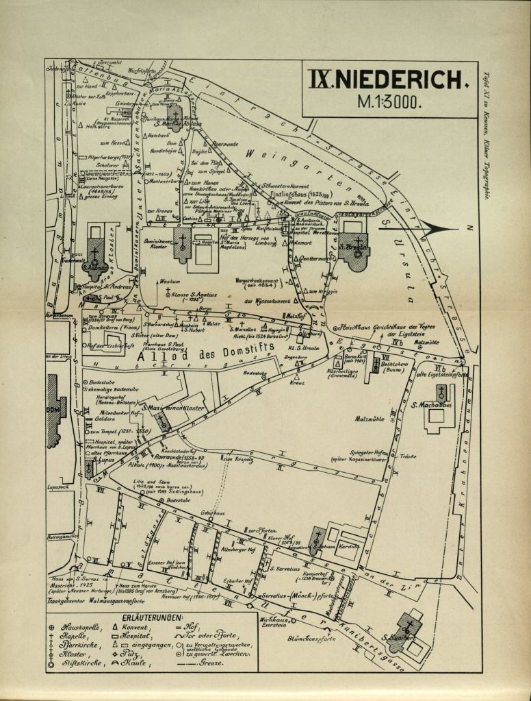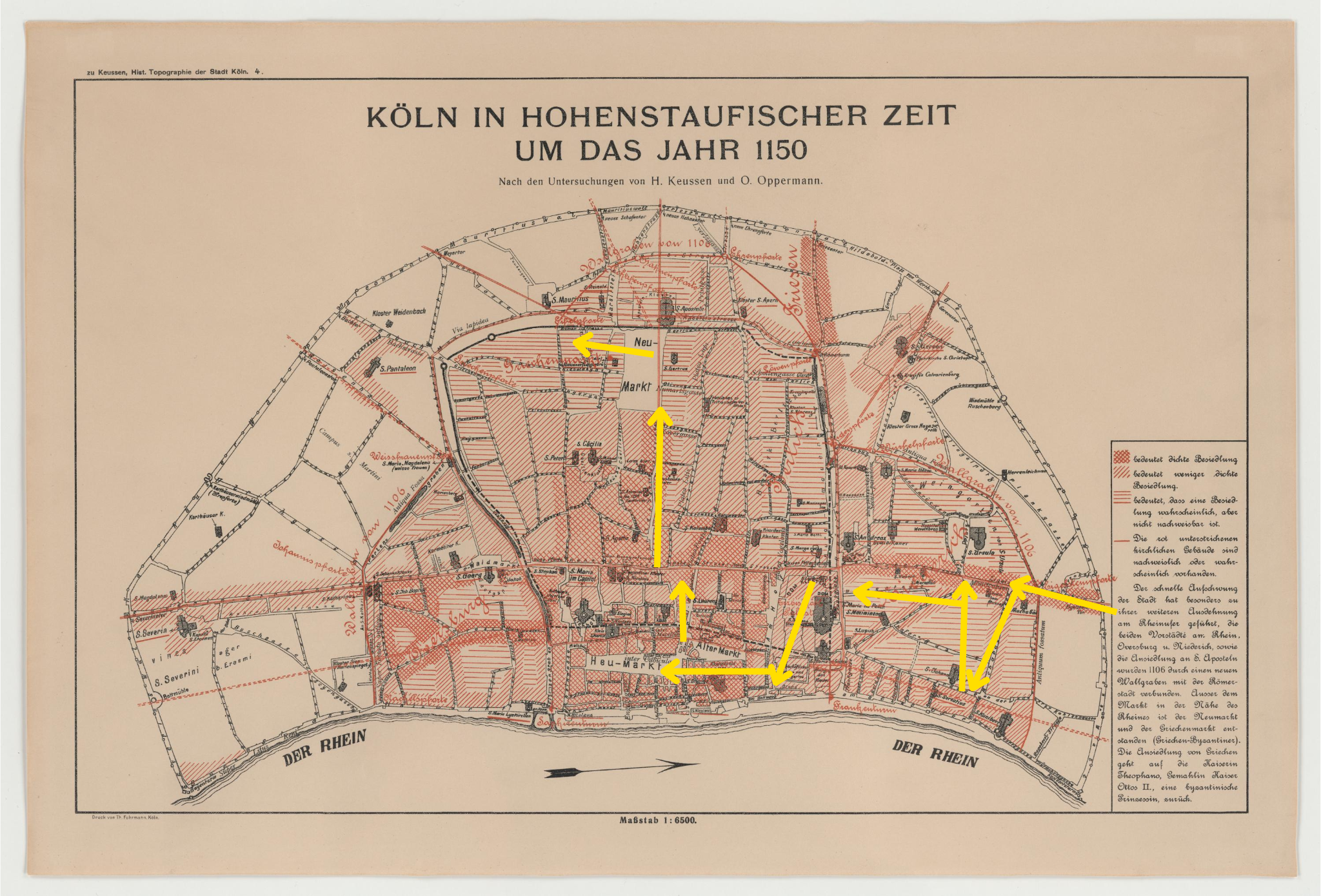 This semicircle shows the former northern Cologne suburb of “Niederich.” In it are today’s districts such as the Ursulaviertel in the far west near the monastery of St. Ursula, then in the middle the Eigelsteinviertel and in the east directly on the Rhine the Kunibertsviertel around the monastery of St. Kunibert.