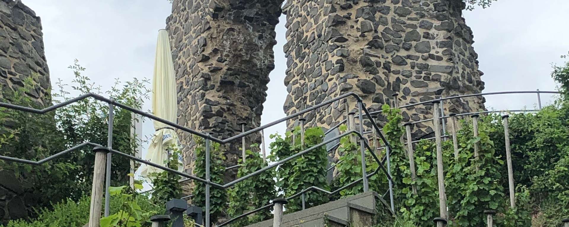 The remains of Wolkenburg Castle. As most the once 25,000 (!) medieval castles in Germany, Wolkenburg Castle does no longer exist. Even the mountain where once this castle on the Rhine river once stood, does not exist anymore, it crumbled because of a close quarry.