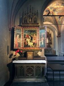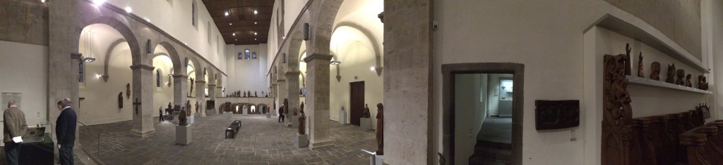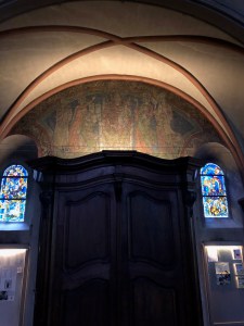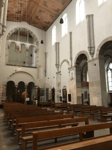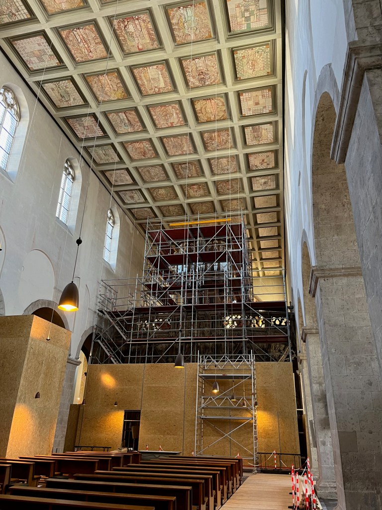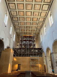 …can still be seen in St. Pantaleon where they kept the flat ceiling. Even though the later added windows with the pointed arches close to the ceiling are from the later late-medieval Gothic architectural style.
