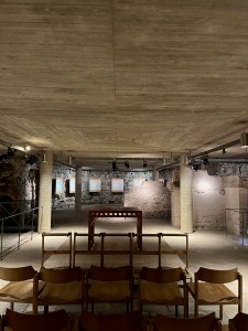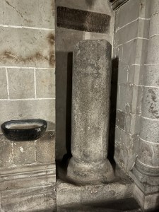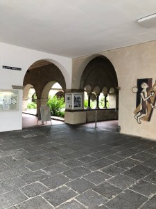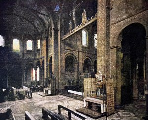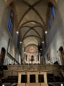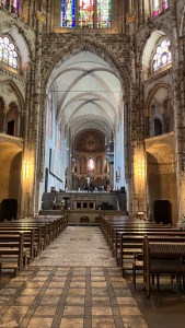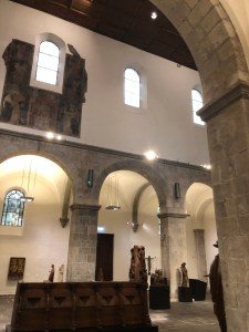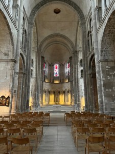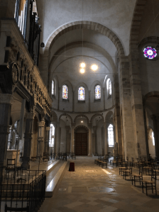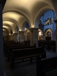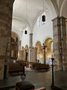 A typical main nave of a Romanesque church in St. George. Between the main nave and the side aisles in the back, the massive walls were broken by bridge arches set on round columns or or on angular pillars. St. George even has both: columns and pillars. So that one can pass between the central nave and the side nave.