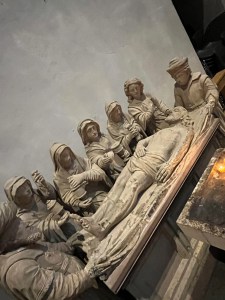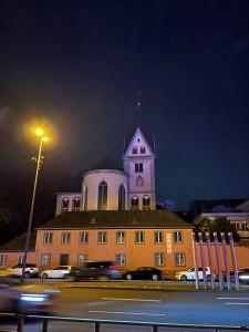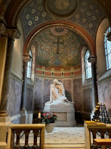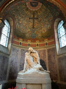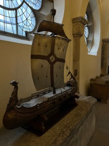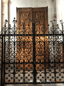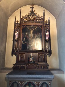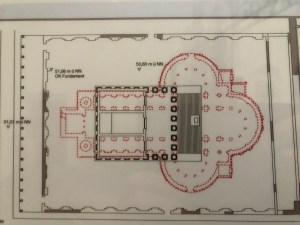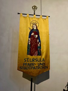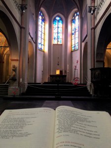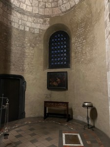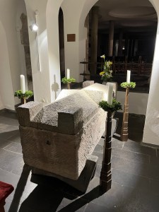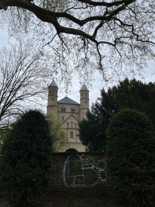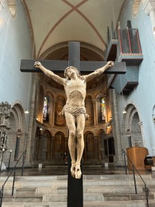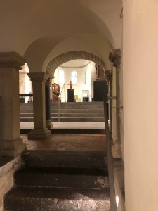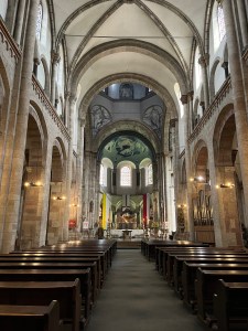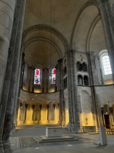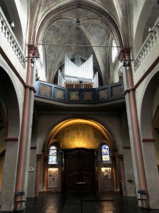 St. George is one of the Romanesque churches that got its vaulted ceilings added in later times. Where once the grey pillars ended at the top, there was just a flat wooden ceiling. This style of having just a flat ceiling instead of a vaulted late Romanesque version can still be seen…