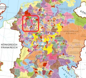 The “Hzm Berg” was still the County of Berg on the left bank of the Rhine (Rhein). All territories in purple belong to the Cologne Church. Notice to the north the County of Cleve. And in the west the Duchy of Limburg. Two of the major rivals of the House of Berg.