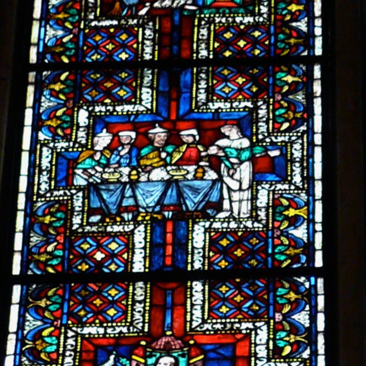 The weaning of Isaac in the Older Bible Window. All men involved are wearing so-called Jewish hats. These are wide-brimmed hats with a pointed tip. In Christian art of the Middle Ages, this was a stylistic device to depict figures, i.e. people of Jewish faith, as such. Many times as a devaluation, sometimes just to show that these people were connected to Judaism.